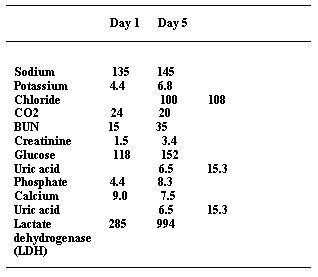 A 53-year-old Black male, with a history of hypertension, hepatitis C, and newly diagnosed nonsmall cell lung cancer, undergoes his first round of chemotherapy, which includes cisplatin. You are called to see this patient 5 days into his hospitalization for oliguria and laboratory abnormalities. Other than the chemotherapy, he is receiving lansoprazole, acetaminophen, and an infusion of D5-- 0.9% normal saline at 50 mL/h. On examination, his BP is 98/60 and heart rate is irregular, between 40 and 50 bpm. His physical examination shows a middle-aged male in no acute distress. His cardiac examination is unremarkable, his lungs show bibasilar crackles, and the abdominal examination is positive for a palpable spleen tip without any hepatomegaly or abdominal tenderness. He has trace bilateral ankle edema. His distal pulses are irregular. The neurologic examination was unremarkable. His laboratory (serum sample) results are as follows