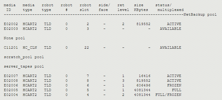 A backup job configured with a retention level of 2 and “Policy volume pool” set to the “server_tapes” is failing due to status code 96: Unable to allocate new media for backup. See the output of the available_media command below: