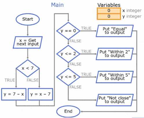 Follow the flowchart's paths and apply the operations as indicated by the symbols and connectors.