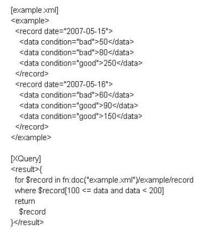 Assume you wish to execute a query on [example.xml] (separate window) to obtain a record element that includes a data element having a value equal to or greater than 100 and less than 200. Select the correct result of executing the [XQuery] (separate window). The expected result would be "C;" however, the query may not be processed as expected.