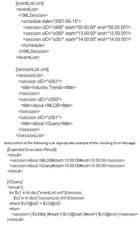 An [XQuery] was executed to join [eventList.xml] and [sessionUst.xml] (referenced in a separate window) and obtain the following [Expected Execution Result].